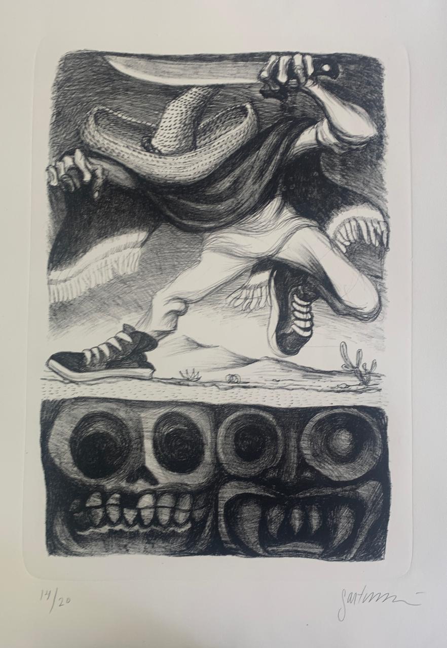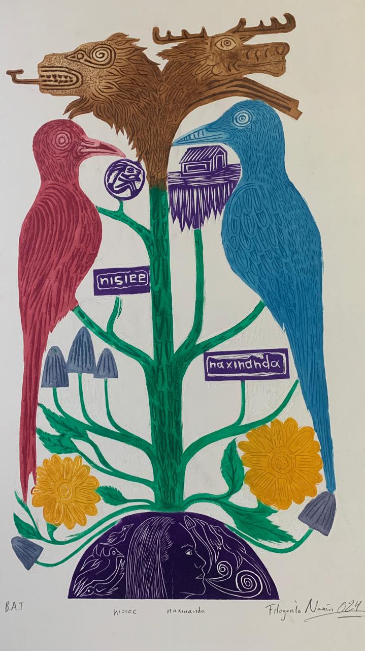 “Desarrollar la técnica es la influencia del grabador. En el aguafuerte se barniza la placa, se calienta, se hace duro el barniz, el artista raya y descubre el cobre que es dónde va a atacar el ácido, dependiendo la intensidad del trazo son los efectos o las líneas; pero el artista no tiene que lavar la placa en ácido, solamente se enfoca en hacer el trazo, tallar el metal o la madera, él trae una idea y juntos vamos tomamos la decisión de qué técnica debemos desarrollar. Dependiendo la intensidad, menos tiempo más clara la línea, más tiempo más fuerte; el aguatinta que se maneja con resinas, nos da líneas; la resina llena una partes; la azúcar se descubre y en la placa se mete el ácido que definen las tonalidades. Ahí entra el taller, me encargo de ponerle barniz a la placa, meterla el tiempo justo al ácido, preparar los materiales, las herramientas, lo que se necesite para hacer el progreso de la transfiguración y sacar las impresiones, llevar el proceso y darle seguimiento hasta llegar al punto final”, abunda.