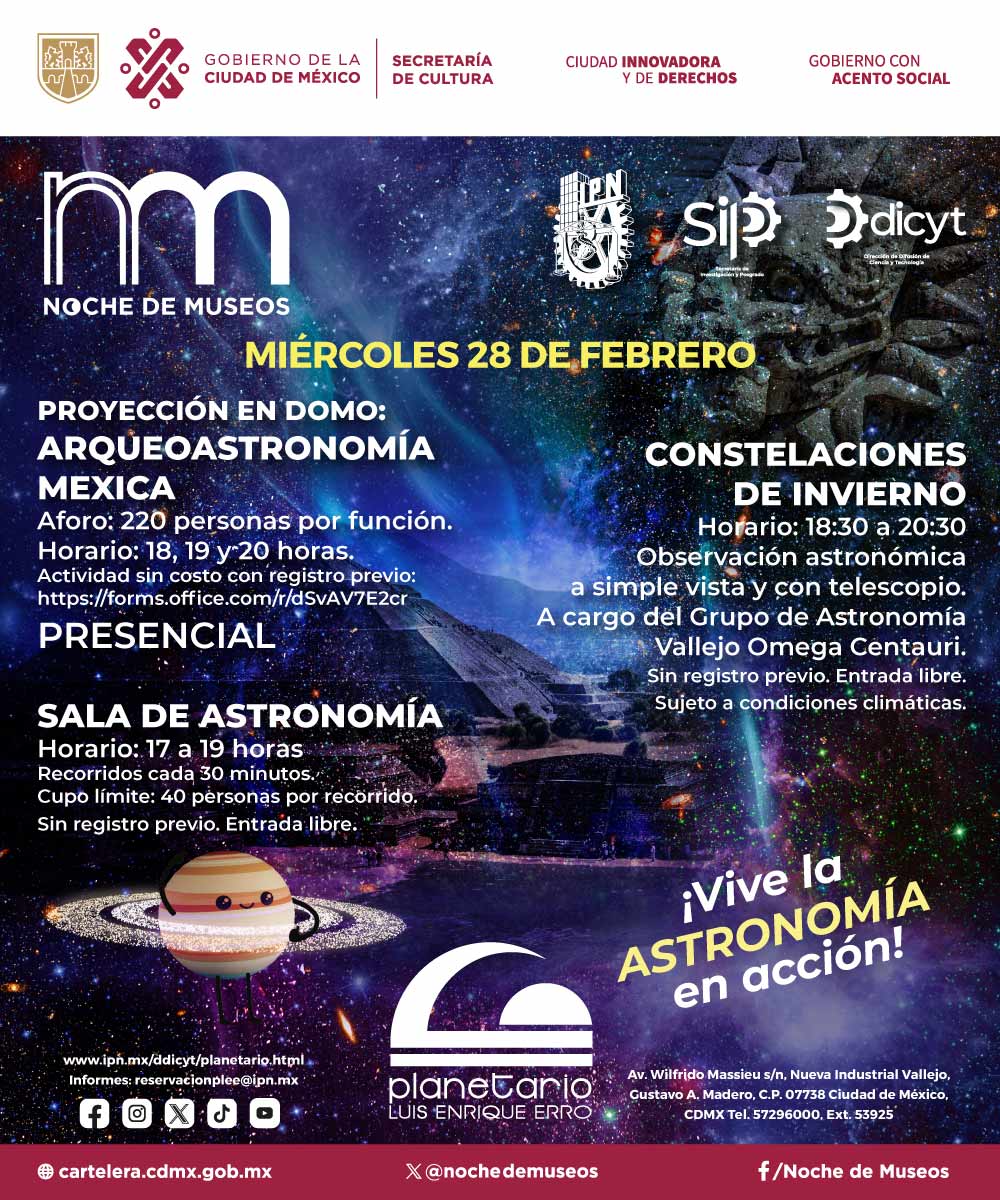 Si te gustaría explorar más sobre nuestro planeta y conocer misterios sobre el universo, no te puedes perder lo que organiza el planetario del IPN. Acércate a la ciencia y vive la Astronomía en acción, podrás hacer observación astronómica al lado de los expertos, además se proyectará la función «Arqueoastronomía Mexica» y habrá recorridos por la sala de Astronomía.
