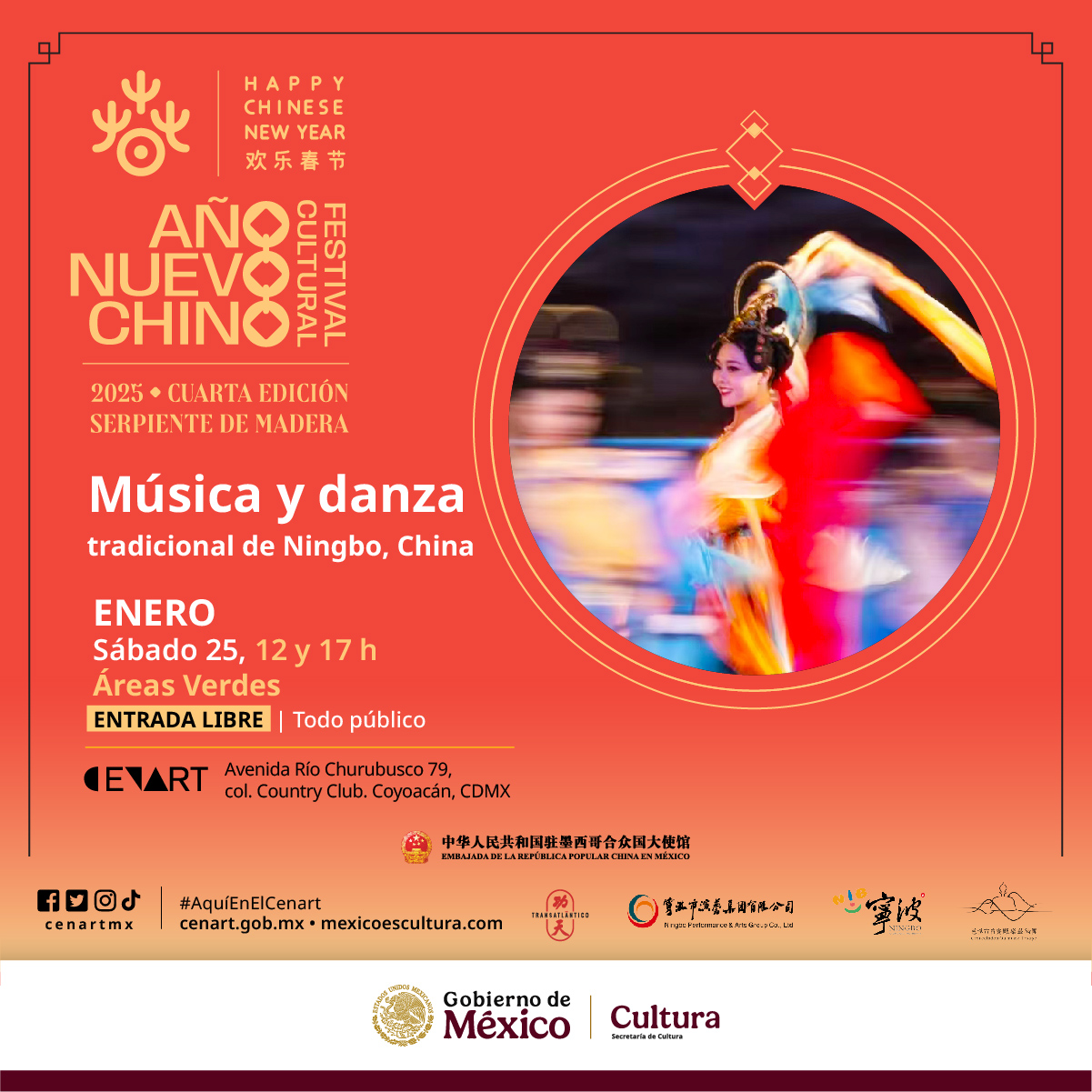 El Centro Nacional de las Artes (CENART) en colaboración con la Compañía Transatlántico y el apoyo de la Embajada de la República Popular China en México presentaron  el programa del Festival Cultural de Año Nuevo Chino (FCANCh) “Serpiente de Madera”, que se llevará a cabo el sábado 25 de enero del 2025, en las Áreas Verdes.