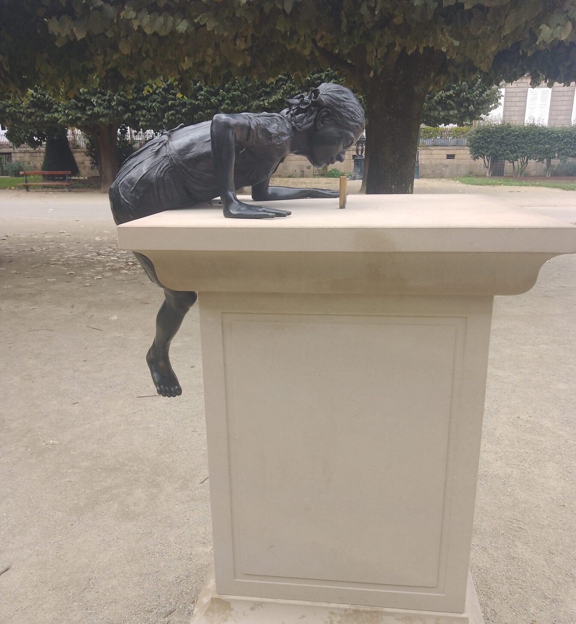En en centro del paseo está la estatua de Cambronne, el general de Napoleón oriundo de Nantes, famoso por haber dirigido la famosa palabra: ¡Merde! a los ingleses durante la batalla de Waterloo, según Víctor Hugo en Los Miserables. La gente francesa refinada que no quiere pronunciar esta palabra dice: Le mot (la palabra) de Cambronne… En un rincón de este paseo me intrigó una estatua de una niña tratando de subirse a un pedestal vacío. Se llama transgresión y no encontré el nombre del autor.  Sospeché, por el humor y la estética, que se trataba de Philippe Ramette, el que hizo el Paso hacia el lado (pas de côté) en una plaza céntrica de aquí. Con esto les van las fotos de Zeus, de la niña y del señor enigmáticos, como sorpresas de Nantes ¡la ciudad atlántica y surrealista!